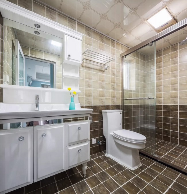 ▲主衛(wèi)的墻面墻面與公用衛(wèi)生間一樣的褐色地磚,顯得復(fù)古調(diào)滿滿的。