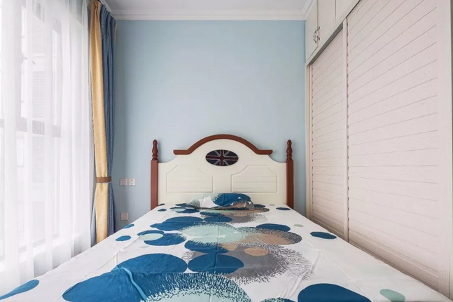 ▲次臥保持清新精致的空間格調(diào)下,一張象牙白色的床與木色的床體框架,還有百葉紋理的衣柜門,搭配上一張精致的床單,顯得格外的優(yōu)雅溫馨。