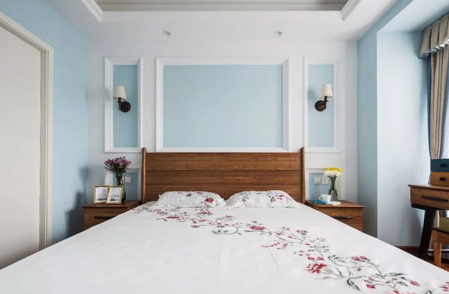 ▲臥室的床頭背景墻以邊框造型,造型內(nèi)部藍(lán)色+四周白色的藍(lán)白配,結(jié)合對(duì)稱的壁燈與床頭柜,整個(gè)空間都顯得格外的穩(wěn)重清新。床頭柜上布置著 精致的插花,一本書(shū)籍一個(gè)茶杯,整個(gè)空間都顯得情調(diào)而溫馨。