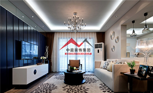 客廳主要運(yùn)用灰調(diào)做主調(diào),深藍(lán)色的電視背景墻凸顯出區(qū)域感,讓整個(gè)空間充滿神秘又不失格調(diào)的優(yōu)雅。
