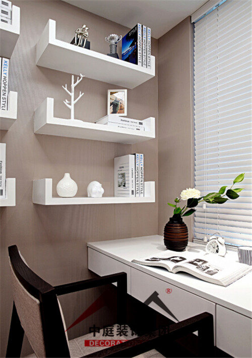 開放式的書房因?yàn)榭臻g有限,設(shè)計(jì)師在墻面做了些架子,即起到了裝飾作用,也能用來放置書跟裝飾品,一舉兩得。
