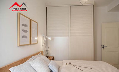 現(xiàn)場訂制的衣柜與房間的大小剛剛合適,推拉式的柜門節(jié)省了不少空間。