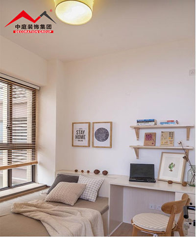 小小的書房在飄窗旁訂制了榻榻米,在美觀舒適的基礎(chǔ)上增加了儲物的功能。