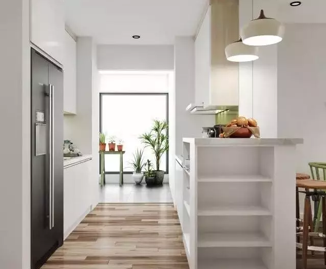 廚房以白色為主,將一部分的空間留白,平衡了整體效果?,F(xiàn)代化的廚房不僅擁有高顏值,更加突出功能性與存儲(chǔ)性。