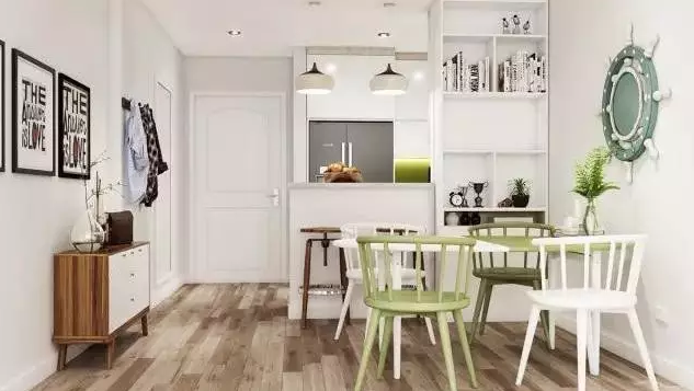 開(kāi)放式的餐廳內(nèi)選擇一些綠色餐椅呼應(yīng)了整個(gè)主題,墻上的裝飾增加了趣味性。