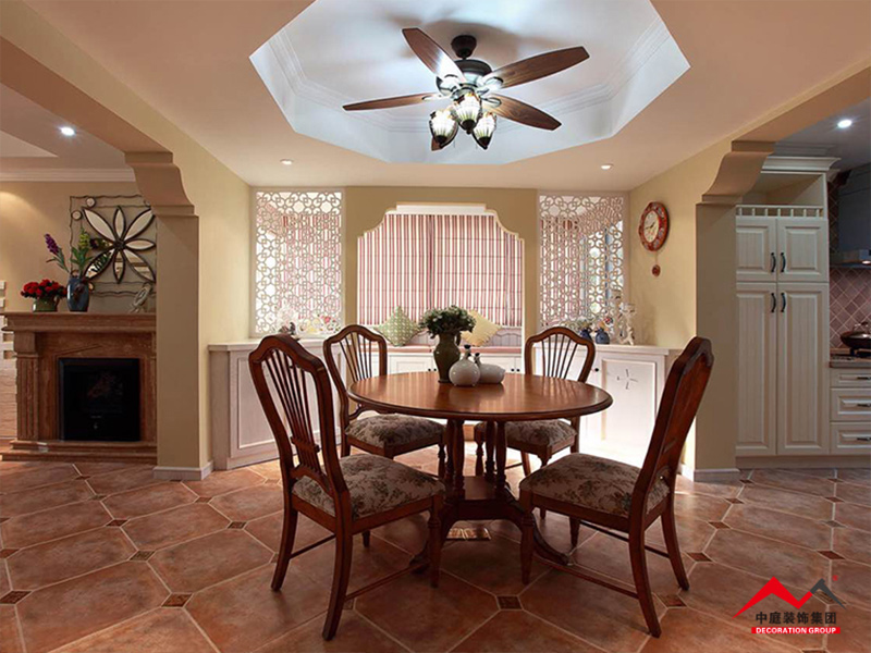 ▲關(guān)于餐廳地板現(xiàn)在一般家庭用瓷磚跟大理石的多一些,為了整體的協(xié)調(diào)也有用木地板,不推薦鋪地毯。