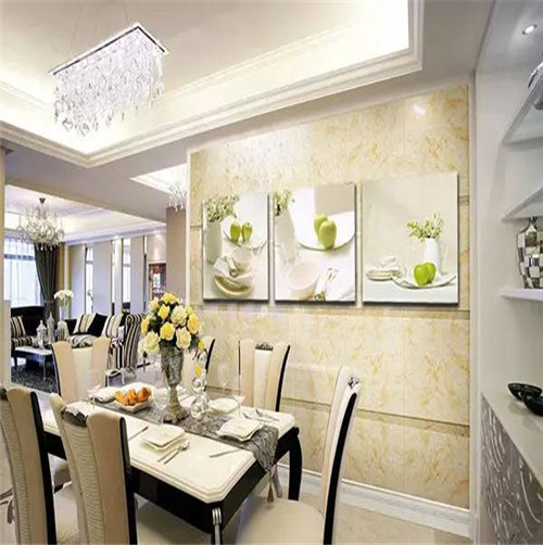 餐廳是進(jìn)餐場所,餐廳應(yīng)營造出一種能夠增進(jìn)食欲、熱情好客的畫面氛圍,給人新鮮清爽的就餐感覺。因此可以選擇一些果蔬、插花、靜物、自然風(fēng)光等題材的掛畫;如有吧臺,可掛一些對應(yīng)酒杯洋酒的現(xiàn)代油畫。