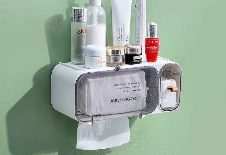 左邊是磁吸設計,洗臉巾抽取式,輕松快捷;右邊是手拉式,方便增添化妝棉;右側面有掛鉤,可懸掛頭箍、手鏈、項鏈等物品;頂部置物,可放日常的護膚用品。