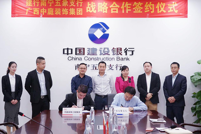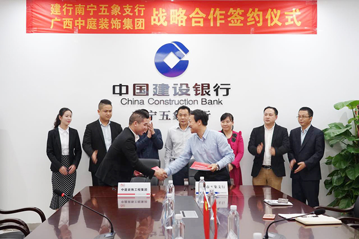 4月3日,中國(guó)建設(shè)銀行南寧五象支行與中庭裝飾集團(tuán),舉行“裝修貸款戰(zhàn)略作協(xié)議”簽約儀式。中國(guó)建設(shè)銀行五象支行郭行長(zhǎng)、何副行長(zhǎng),中庭裝飾集團(tuán)湯總、張總等一同參加了此次簽約儀式。