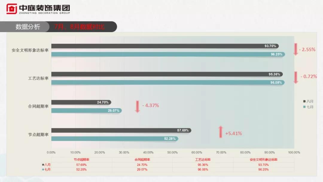 在總結(jié)8月份工作上,項(xiàng)目經(jīng)理個人月度達(dá)標(biāo)率和客服回訪業(yè)主評分成為衡量他們月度工作的指標(biāo),每到這個環(huán)節(jié),大家的心都懸到了喉嚨眼,但凡工藝達(dá)標(biāo)率和安全文明形象達(dá)標(biāo)率沒有達(dá)到90%及以上的,都要上臺面向所有人承諾,下月勢必做好工地管理,雙向達(dá)標(biāo),否則按制度處罰!