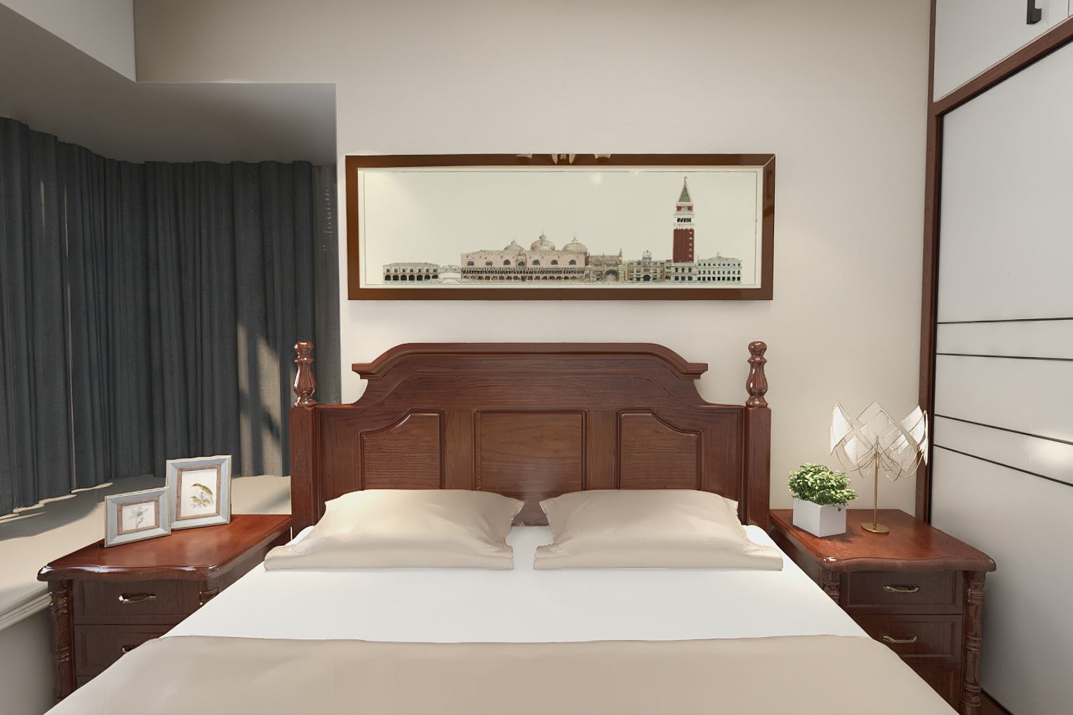 整體色調(diào)以奶咖色為主,加以綠色點(diǎn)綴,大膽的撞色使整體空間顯得活躍又多了幾分復(fù)古韻味。在家具搭配上多為木制家具,木制家具自然溫潤(rùn)的特性讓人感覺(jué)舒適放松,設(shè)計(jì)簡(jiǎn)潔卻不失特色。