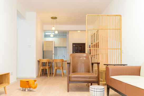 整個(gè)空間基于原木風(fēng)格上做搭配,陽(yáng)臺(tái)打通,解決不互通的采光問(wèn)題,天氣陰晴,都可以為空間做天然點(diǎn)綴;開(kāi)放式廚房和餐廳可以共享操作,互不干擾,又可以加強(qiáng)家人之間的互動(dòng)性提高家庭的幸福感。