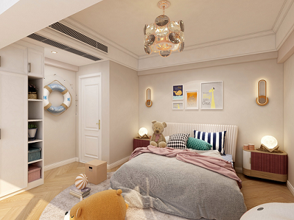 整個(gè)空間主要在軟裝搭配上做文章,運(yùn)用比較童趣的掛畫(huà),掛件等裝飾,讓空間生動(dòng)活潑起來(lái)。